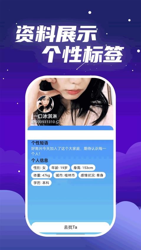 用户可在个人页面编辑多方面的资料进行全面的自我展示,吸引同好。资料支持上传多张照片、填写详细兴趣爱好,还能添加个人简介和交友宣言,全方位展现个性魅力。