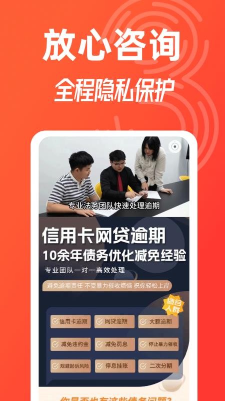 平台提供包括债务重组、协商还款、法律维权等在内的全方位服务。针对不同类型的债务问题,如信用卡逾期、网贷拖欠等,都有专门的解决方案,满足用户多样化的需求,帮助用户走出财务困境。