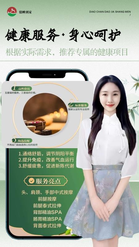貂蝉到家官网版APP是一款专注于提供高品质上门按摩与养生服务的应用软件。平台汇聚了丰富多样的推拿按摩项目,从传统中式推拿到国际流行的SPA护理一应俱全,所有服务项目均明码标价,让用户能够根据个人需求自由选择。平台严格筛选专业技师,每位服务人员都经过实名认证和专业技能考核,确保服务质量和安全性。此外,软件还提供每日更新的优惠活动,让用户享受更多折扣福利。无论是想缓解工作疲劳,还是追求身心放松,貂蝉到家都能为您带来专业、便捷的上门服务体验。