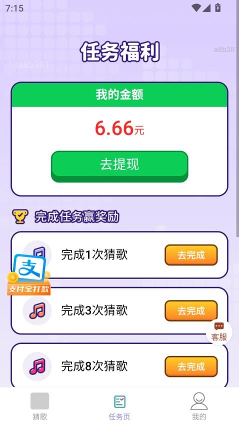 有问题可在线咨询客服,及时响应并帮助你解决麻烦,日常猜歌赚钱更方便;7×24小时专业客服团队,随时为用户解答疑问。