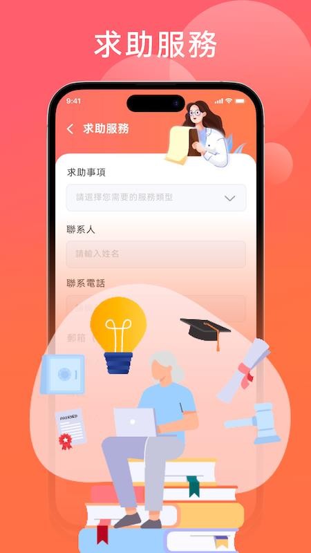 在求助服务功能中可将求助事项以及联系人信息详细填写后提交求助,紧急情况可一键拨打求助热线;