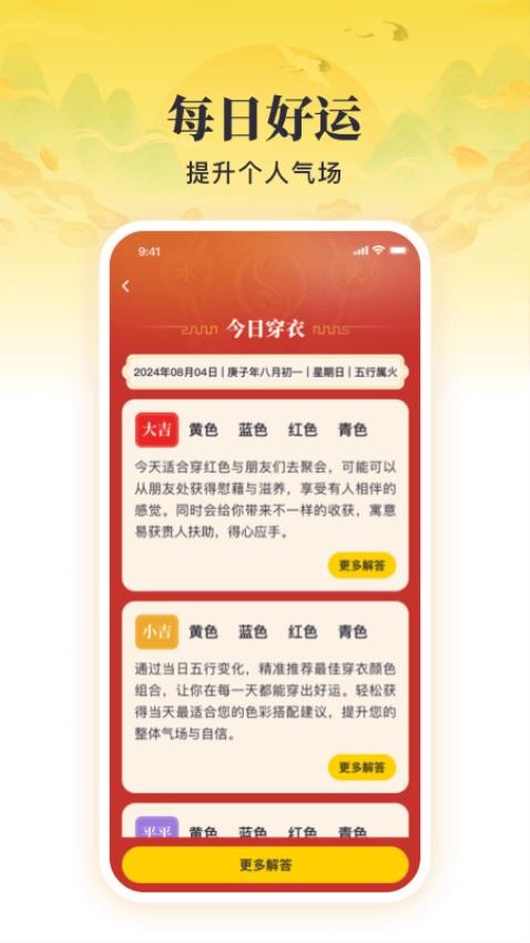 通过五行穿衣、运势分析等功能,帮助用户全面提升个人气场,改善整体精神面貌,增强自信心和吸引力。