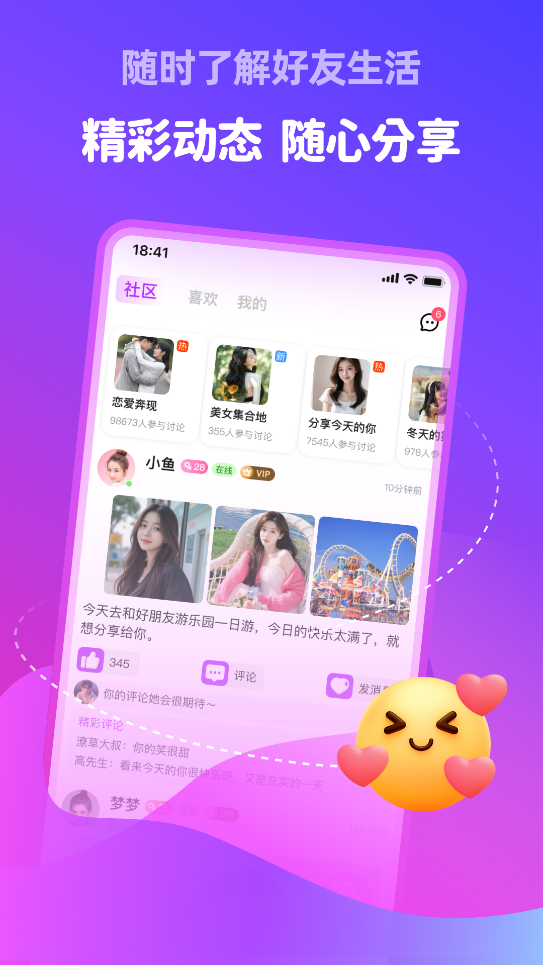 在这里你可以浏览来自全国各地用户的精彩动态,发现有趣的生活分享。通过点赞、评论等方式与心仪对象互动,拉近彼此距离。广场还设有热门话题讨论区,参与互动能获得更多曝光机会。系统会智能推送你可能感兴趣的内容,让你不错过任何一次可能的邂逅。