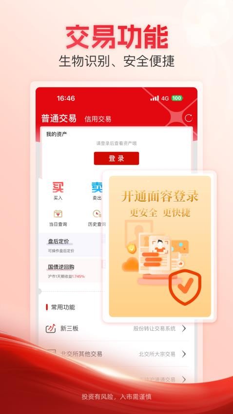 本次更新带来了全新的UI设计风格,界面更加简洁美观,操作更加流畅。新增了指纹和人脸识别登录功能,让账户登录更加安全便捷。同时,软件新增了沪深大宗交易和信用额度调整功能,满足更多专业投资者的需求。此外,本次更新还特别推出了敬老版,优化了字体大小和操作流程,方便老年用户使用。最后,修复了一些已知问题,进一步提升了软件的稳定性和安全性。
