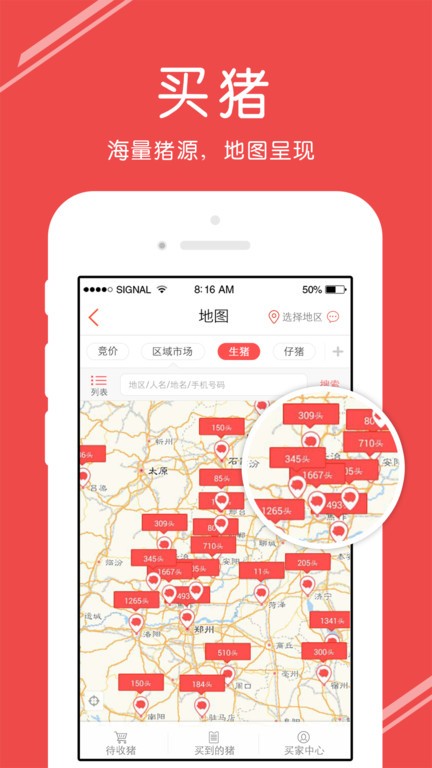 以地图的方式来展现周边的生猪信息,可以更方便买家挑选。平台整合了全国上万家养殖场的资源,提供多样化的猪源选择。