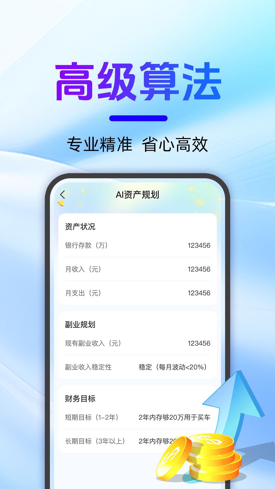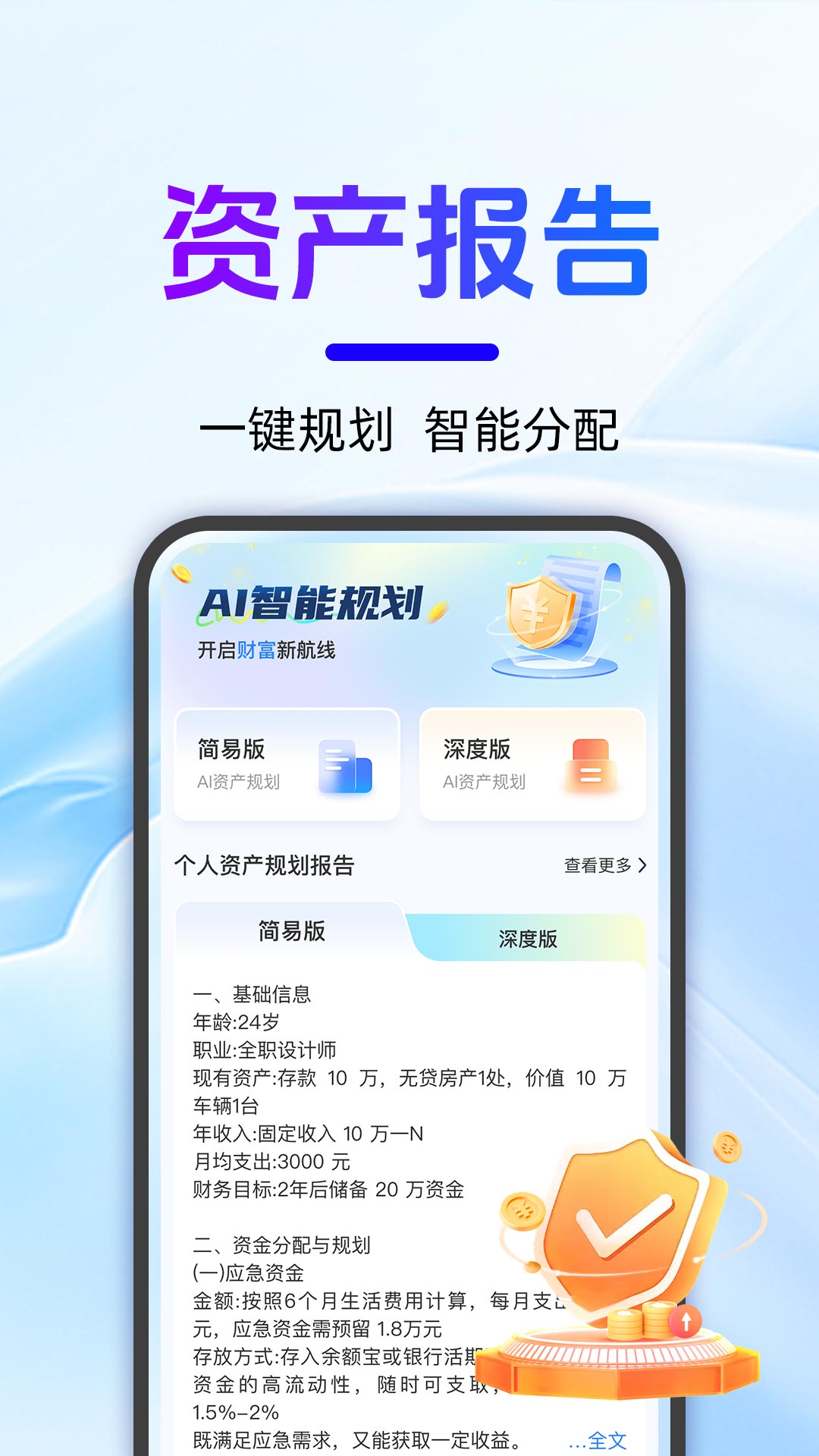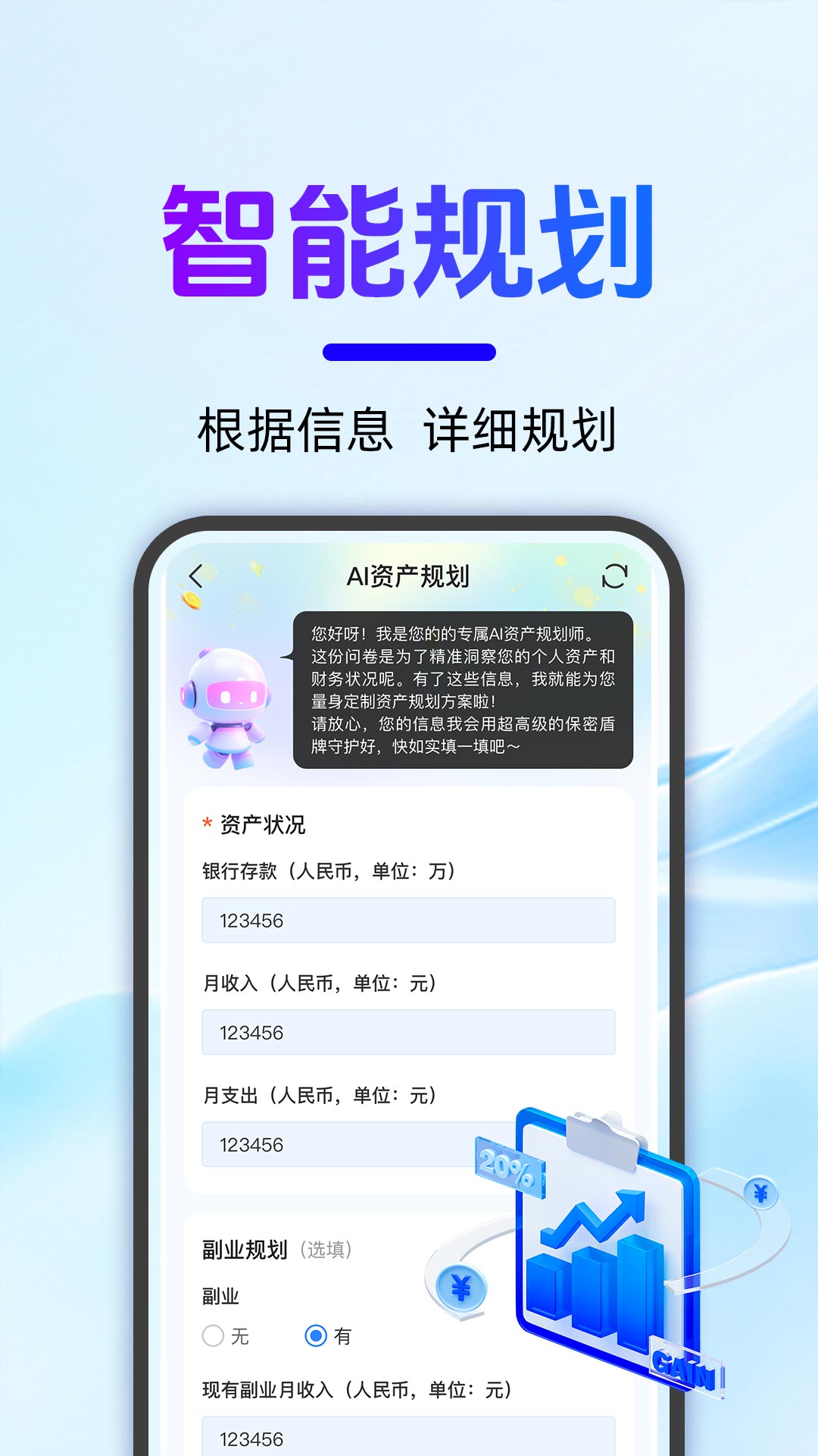 AI理财师——您的智能资产规划专家!这款革命性的金融科技应用将人工智能与专业理财知识完美结合,为您提供全方位的财富管理解决方案。通过深度分析您的现有存款、每月稳定收入及各类固定支出,系统能够自动生成科学合理且切实可行的资产配置方案,帮助您建立健康的财务体系。