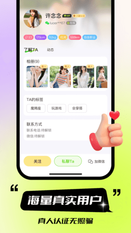 提供了线上的真人认证,确保用户可以在线诚信真实的聊天互动。通过人脸识别和身份验证双重保障,有效过滤虚假账号,让每位用户都能放心交友。
