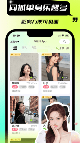 米粒约app是一款专为都市单身青年打造的同城交友平台,致力于为用户提供真实、有趣的社交体验。平台汇聚了海量同城优质用户,通过智能算法精准匹配,帮助用户快速找到志同道合的朋友。在这里,你可以轻松浏览附近帅哥美女的个人主页,通过即时聊天功能建立联系,还能参与线下聚会活动。无论是想寻找恋爱对象,还是拓展社交圈,米粒约都能满足你的需求。平台采用严格的实名认证机制,确保交友环境安全可靠,让每位用户都能放心社交。