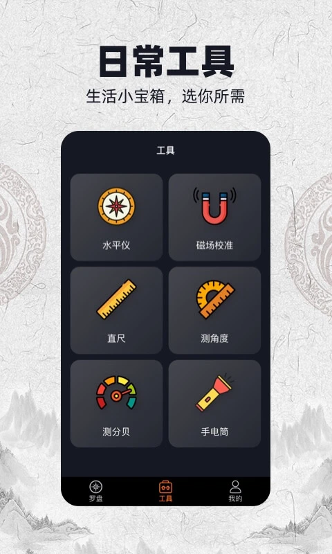 除了核心的罗盘功能外,AR罗盘还内置了丰富的辅助工具集:水平仪可确保物品摆放平整;磁场校准功能保证测量精度;实用的直尺和角度测量工具让日常测量变得轻松;专业级的分贝检测功能可随时监测环境噪音;内置的手电筒功能在黑暗环境中尤为实用。这些贴心的辅助功能让AR罗盘不仅是一个方位工具,更是一个多功能的实用工具箱。