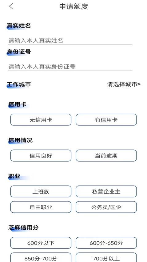 在额度申请页面,填写真实个人信息,包括身份证、联系方式、职业信息等。系统会自动调取芝麻信用分进行评估,无需用户额外操作,整个过程安全加密。