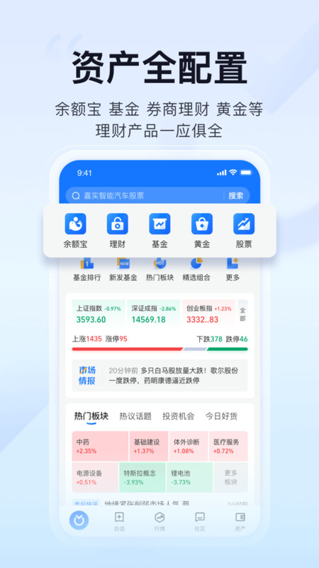 首页余额宝、基金、黄金、定期等理财品类齐全,全面覆盖实时财经资讯、行情信息、市场解读;平台采用智能推荐算法,根据用户风险偏好和投资习惯,个性化展示最适合的理财产品。首页还提供快捷操作入口,方便用户快速完成常用交易。