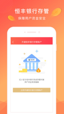 红小宝app是一款专业可靠的互联网金融投资理财平台,由红上金融信息服务(上海)有限公司精心打造,并由恒丰银行提供资金存管服务,确保用户资金安全无忧。平台始终秉持合规运营、真诚透明、稳健规范的理念,为用户提供安全、高效、便捷的理财服务。