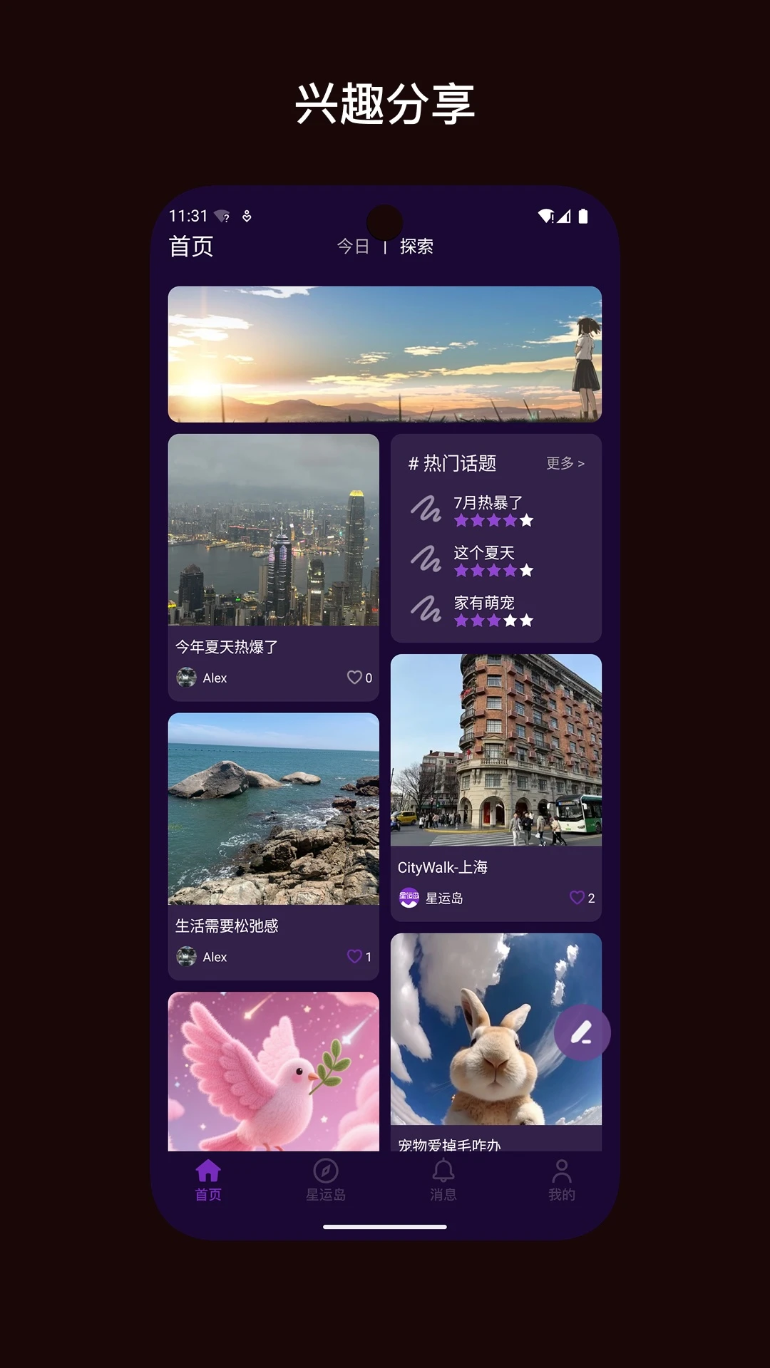 在星运岛,你可以创建专属兴趣圈,与万千同好畅聊热爱的事物。平台采用智能匹配算法,为你推荐最契合的交流群体,无论是小众爱好还是大众话题都能找到知音。独特的标签系统和话题热度榜,让你轻松发现最新潮流趋势,参与讨论还能获得专属成长值奖励。