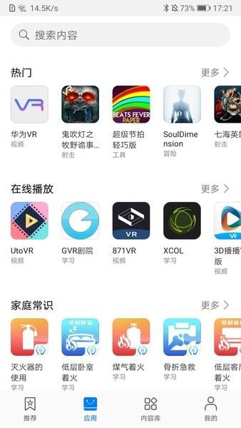 应用架构全新升级,从内容推荐和搜索,到安装卸载和升级,以及手柄的管理,均可在华为VR应用中完成。VR眼镜的中也可以直接下载应用。新增的智能推荐功能会根据用户偏好自动推送可能感兴趣的内容,大大提升了内容发现的效率。