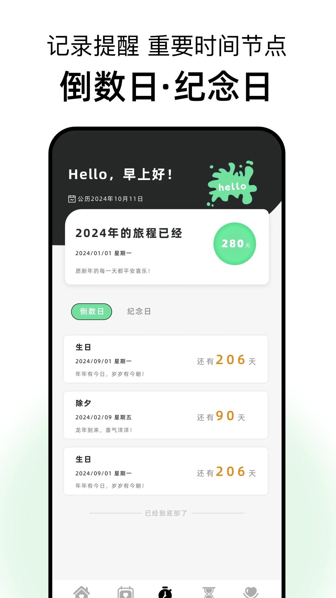 这款应用专注于帮助用户高效管理重要时间节点,通过直观的倒数日期展示、个性化温馨提醒以及智能分类记录功能,让您轻松掌握生日、纪念日、节日等特殊时刻。它不仅能让您提前规划日程,还能通过精心设计的文案营造仪式感,避免错过每一个值得纪念的日子。同时,应用还整合了日常任务管理、待办事项整理和专注模式等实用工具,全方位提升您的时间管理能力,无论是工作学习还是生活安排,都能变得更加井井有条,让每一天都过得更有意义。