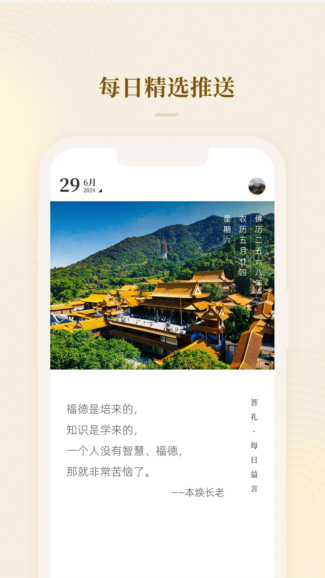 菩是自性,人人心中皆有菩提,万物皆具佛性;礼是修行,日常生活中的衣食住行皆是般若智慧的体现,处处充满禅意与觉悟。菩礼这款应用将禅意美学融入现代生活,为用户打造一个心灵栖息的数字空间。