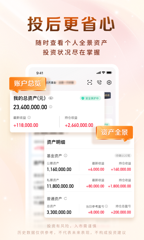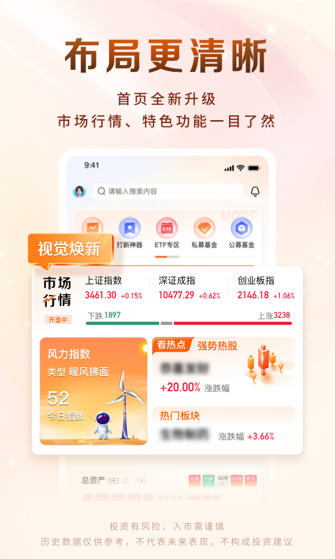 整合账户、资产等信息,方便快捷查询,在这里解锁更多特色服务。个人中心新增了资产走势图表,直观展示投资收益变化。支持多账户统一管理,一个界面即可掌握全部资产状况。个性化设置选项更加丰富,用户可以根据使用习惯自定义界面布局和功能排序。