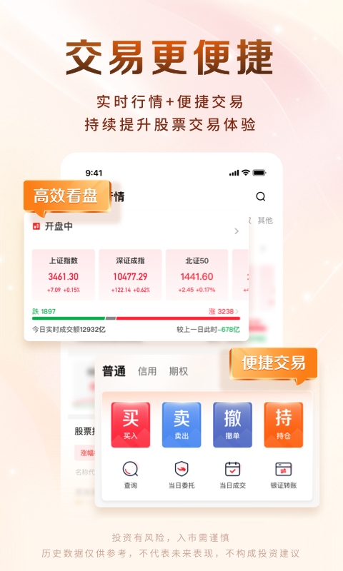 您可在「普通」、「信用」和「期权」交易之间切换自如,交易安全、方便、快捷。交易系统经过全面优化,订单处理速度提升30%,确保在剧烈波动的市场中也能快速成交。新增的一键撤单、批量下单等功能,大幅提升了交易效率。严格的风控体系和多重加密技术,为用户的资金安全提供坚实保障。