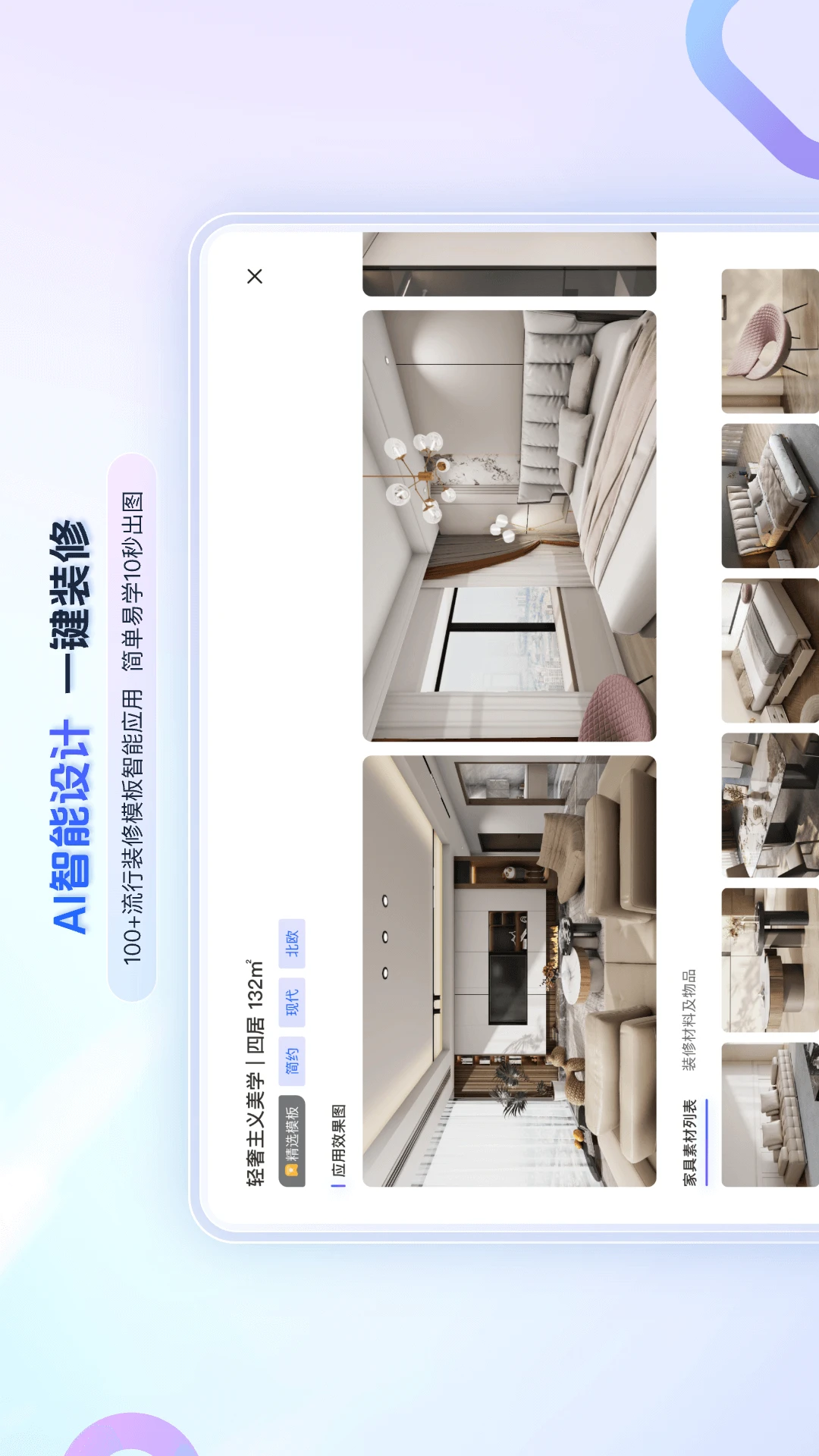 智能装修:基于深度学习算法分析用户偏好,可智能推荐最适合的装修风格和软装搭配方案,从现代简约到新中式风格应有尽有,生成高清效果图仅需10秒,同时自动计算详细报价清单,让预算控制更精准。
