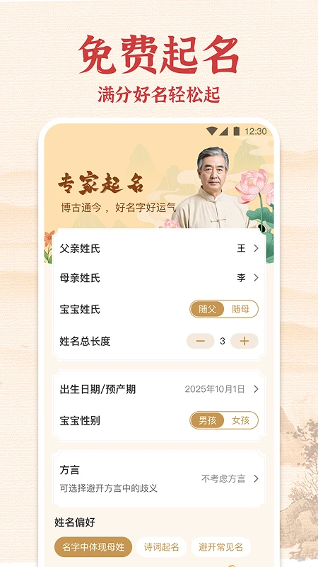 生辰起名是一款融合传统智慧与现代科技的创新起名工具,它将中国传统文化中的姓名学精髓与现代大数据分析技术完美结合。这款软件不仅考量名字的笔画数理、音形意蕴等传统要素,还通过海量数据分析,综合评估时代流行度、独特性、音律美感、字形结构、文化内涵等多维因素。专业国学名师团队为每个名字注入深厚的文化底蕴,确保为每个宝宝量身定制既符合传统又富有现代气息的高分好名。