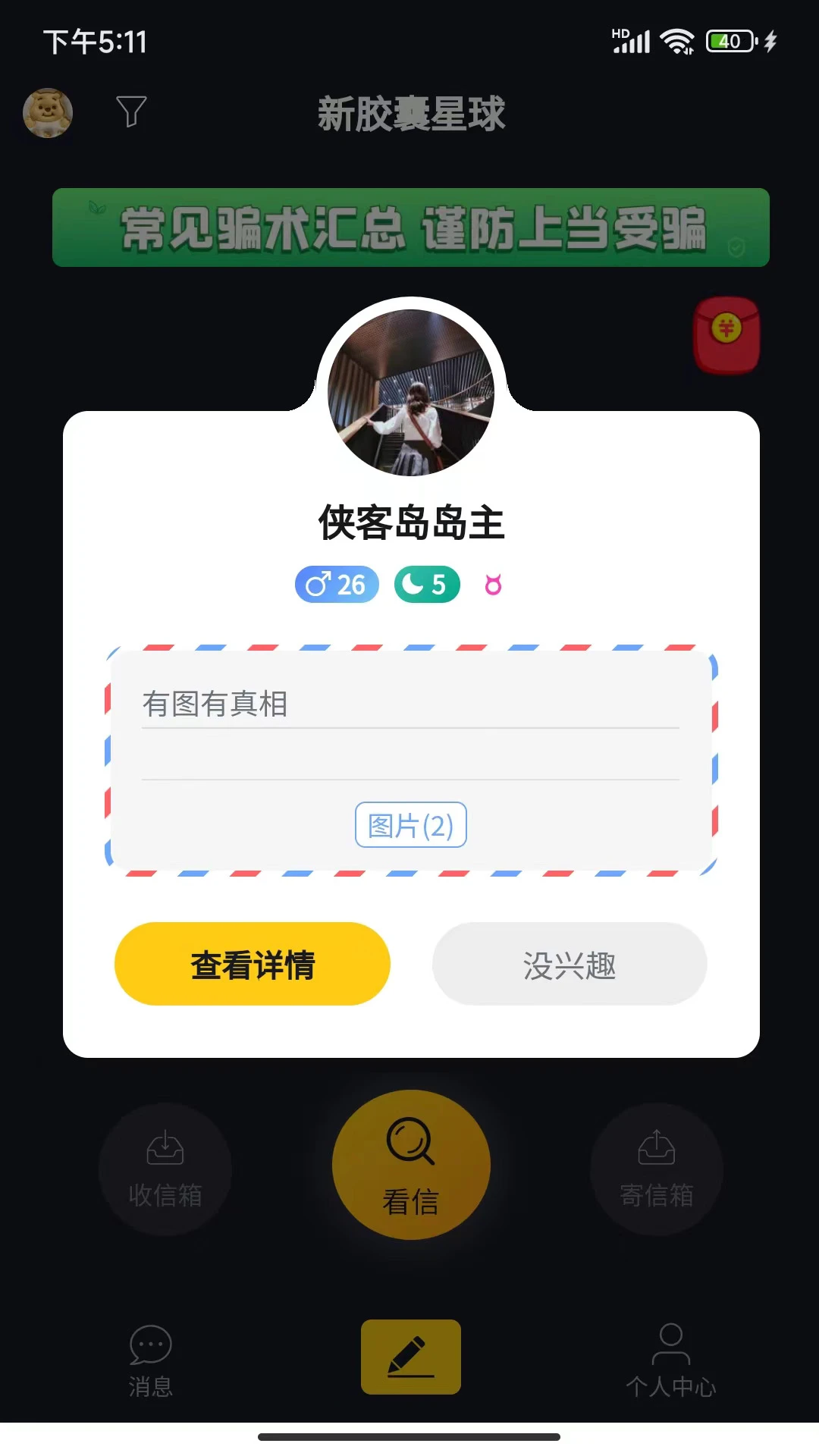 胶囊星球:通过兴趣圈子精准匹配志同道合的朋友,独特的隐私保护机制让所有评论仅对信件主人可见。系统会根据你的浏览记录和互动行为,智能推荐最符合你口味的交友圈子,让你轻松找到三观一致的小伙伴。