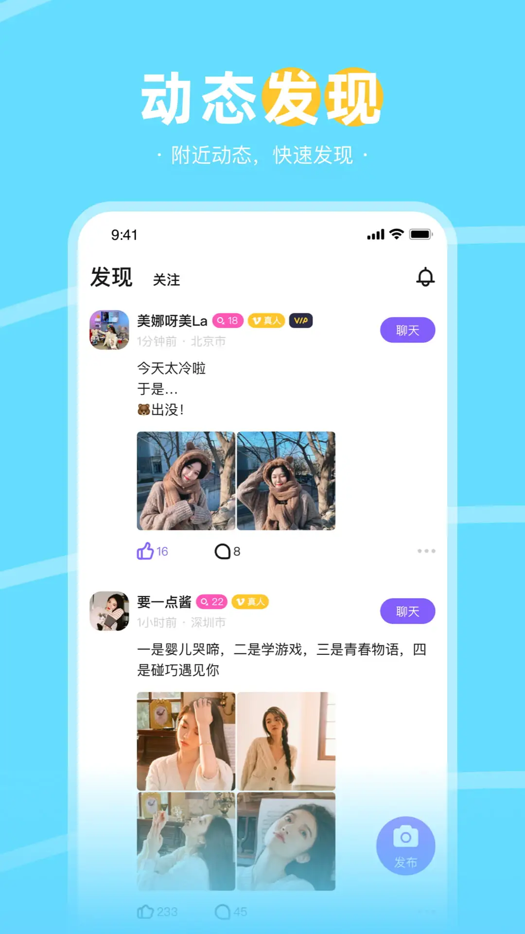 无论您是想为平淡的生活增添色彩,还是渴望分享日常点滴、寻找志同道合的伙伴,趣聊天都是您理想的选择!在这里,您能通过智能匹配系统快速结识兴趣相投的朋友,享受高清语音通话与实时视频互动的乐趣。平台采用先进的音视频技术,确保每次对话都流畅自然,让线上社交如同面对面般亲切。无论是深夜倾诉的温柔倾听,还是欢乐时刻的即时分享,趣聊天都能为您带来充满温度的情感连接,让每段对话都成为值得珍藏的美好回忆。