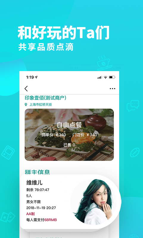 【消费】越拼越开心,和陪伴其实可以形影不离。独创的消费拼单模式支持实时组队,从2人下午茶到10人轰趴聚会都能一键发起。消费后自动生成趣味打卡日记,记录每个欢乐瞬间。
