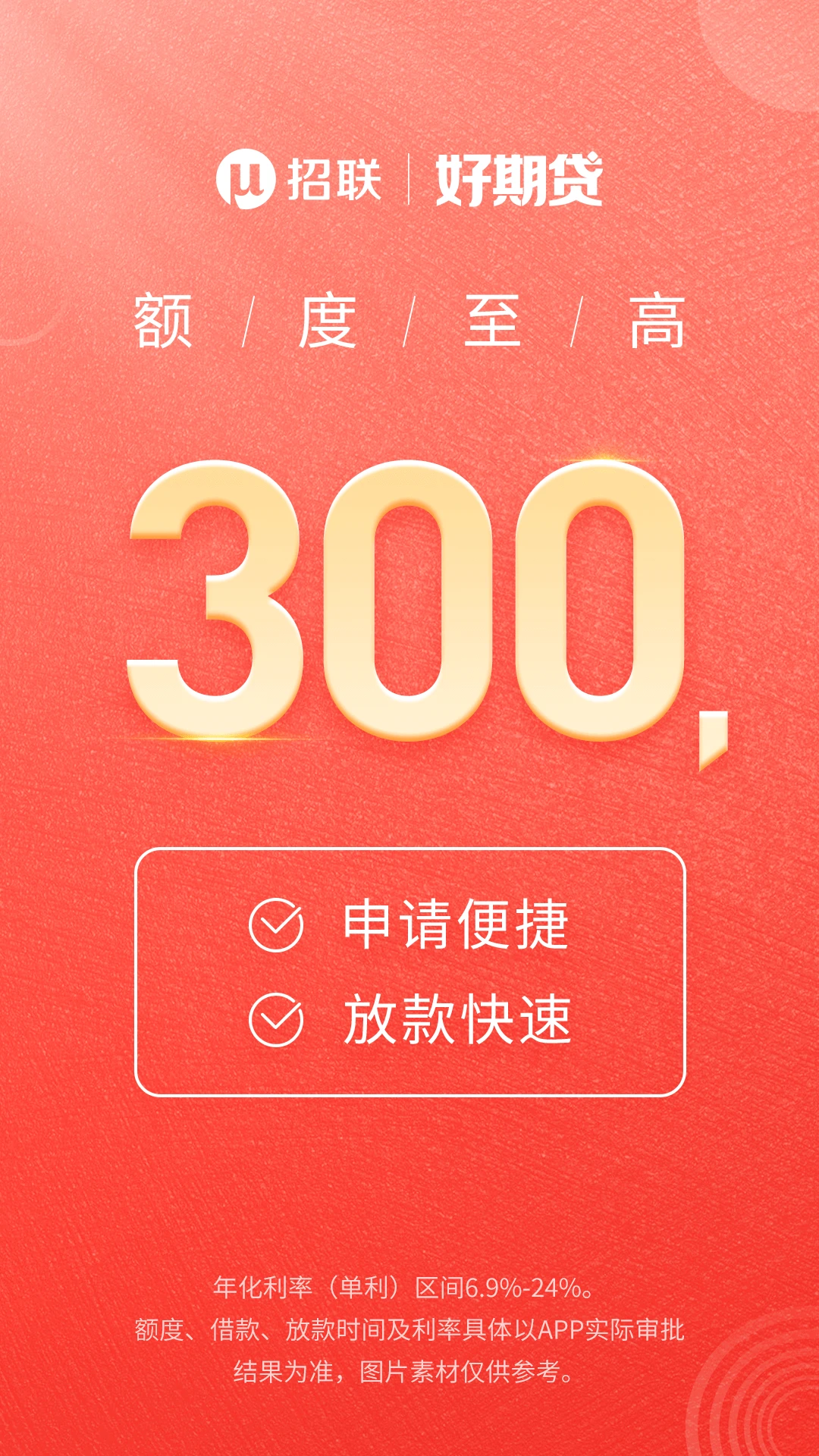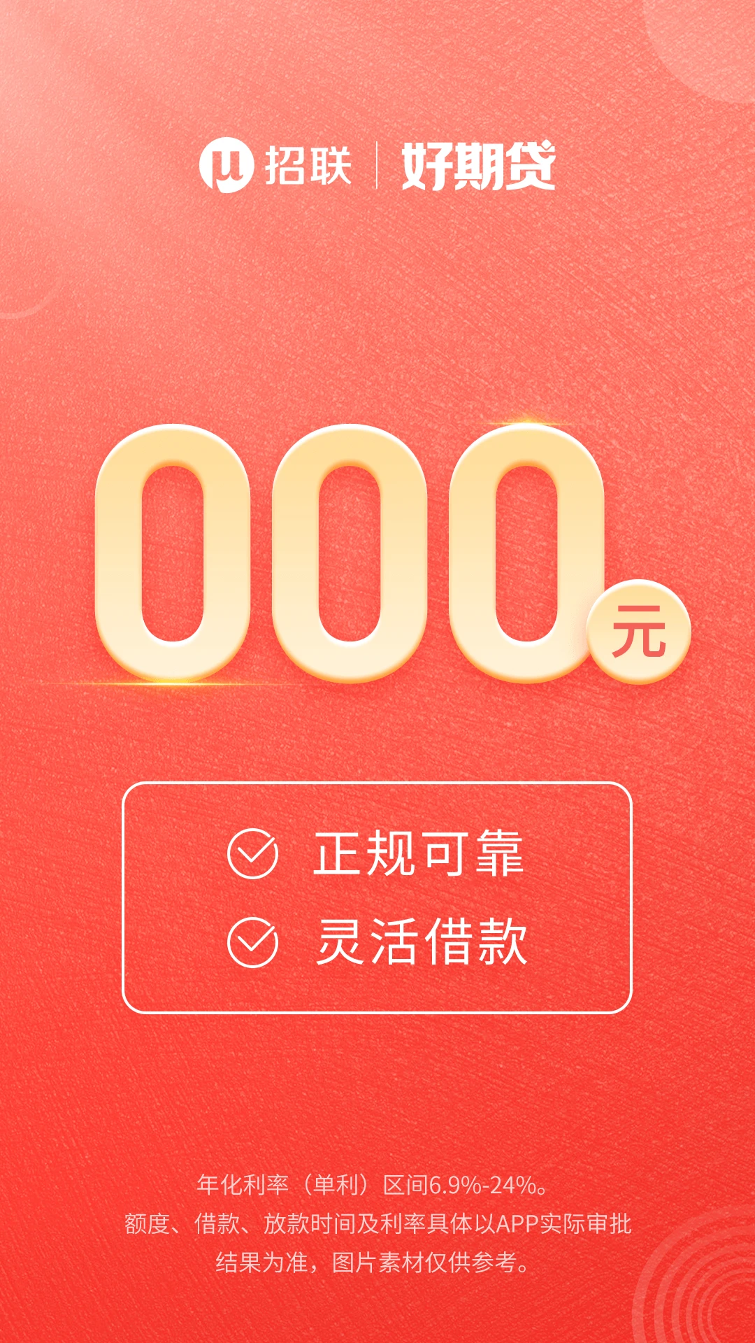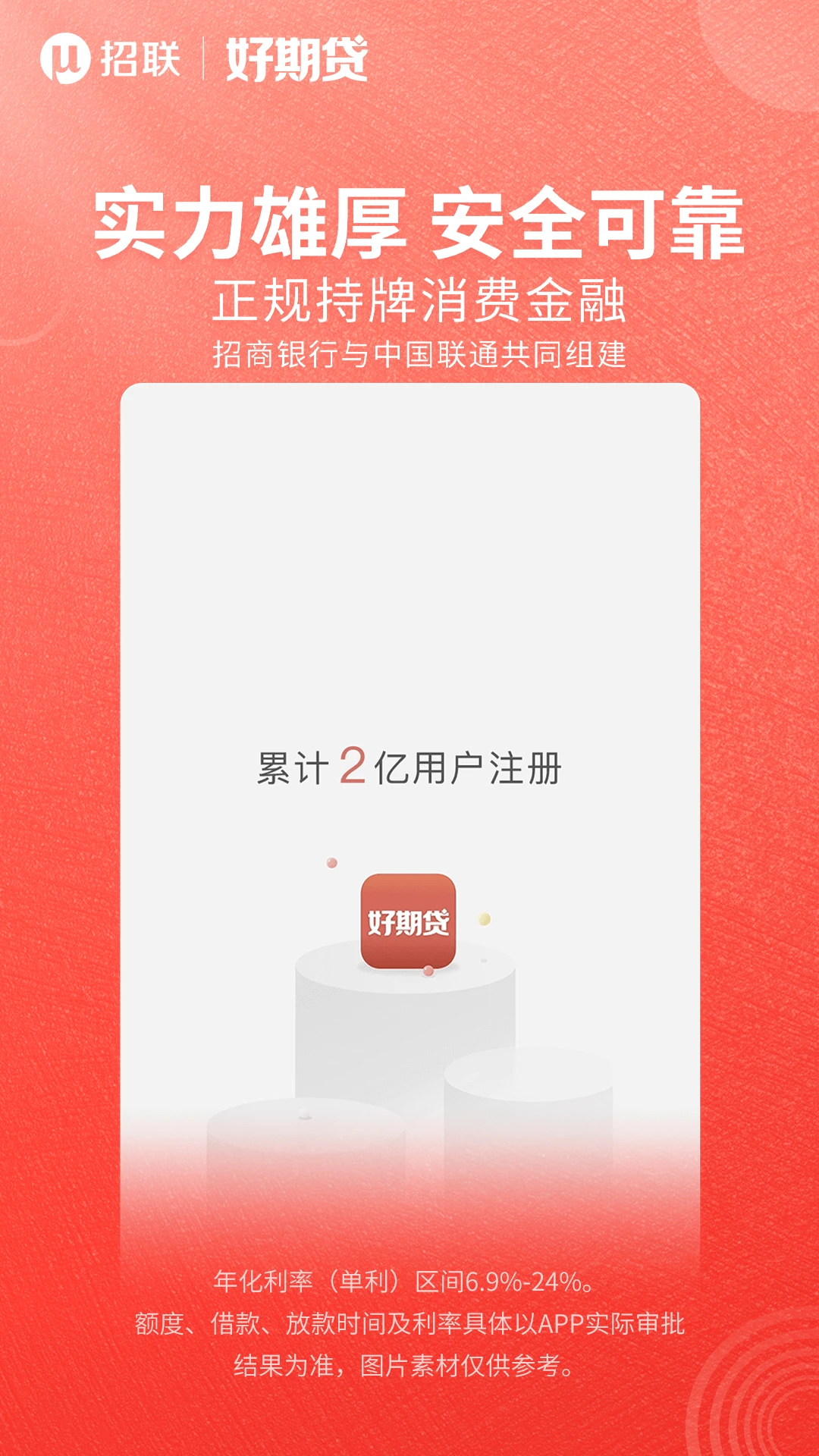 具体活动规则以官方页面展示为准,请仔细阅读相关条款。贷款额度、利率及放款时间将根据您的实际资质由系统审批确定。请注意,招联好期贷仅限用于个人消费用途,请根据自身还款能力合理借贷,树立理性消费观念,按时还款避免产生逾期费用和信用影响。