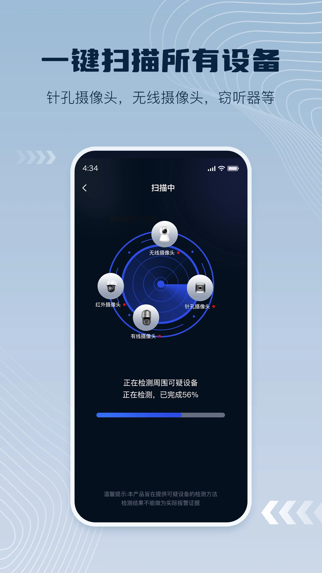 这款软件拥有多项实用功能,能够全方位保障您的隐私安全。首先,它提供了详细的查找摄像头指南功能,内置了市面上常见偷拍设备的详细清单和特征说明,用户可以按照清单逐一排查可疑物品,即使是新手也能轻松上手操作。其次,鹰眼扫描具备强大的局域网扫描功能,能够快速检测当前连接的网络中是否存在可疑设备,特别适合在酒店、民宿等公共场所使用,让您远离网络偷拍的风险。