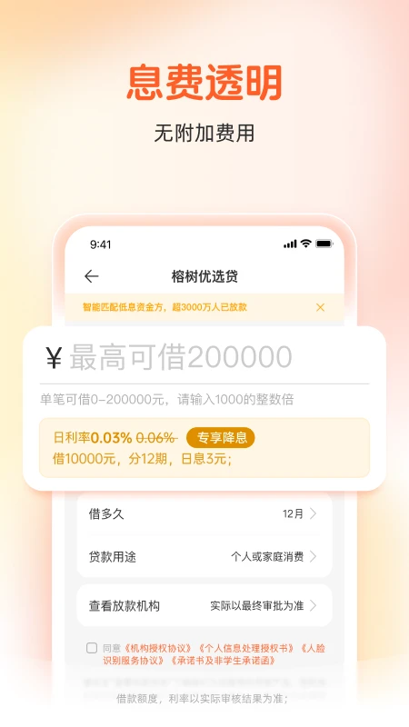 榕树贷款以用户需求为核心打造差异化服务:息费透明方面,提供1万元借1天利息仅2元起的优惠方案,年化利率7.2-24%清晰公示;安全合规方面,采用银行级加密技术与全流程风控体系,确保资金与信息安全;机构合作方面,严格筛选持牌金融机构入驻,保障每笔交易合法合规;产品多样性方面,整合多家主流贷款机构资源,提供信用贷、消费贷等多类型产品,满足不同用户的融资需求。平台通过智能算法实现个性化推荐,让用户享受更精准的金融服务体验。
