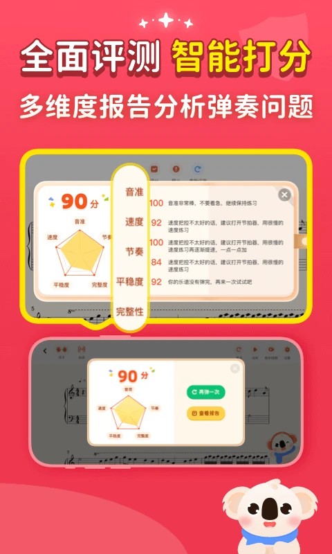 【练琴评分准确测评】 考拉智能陪练的评分系统从音准、节奏、速度等多个维度对琴童的弹奏进行综合评估。系统不仅能准确标注错误位置,还提供错误回放和标准示范功能,帮助孩子直观理解问题所在。通过这种全方位的测评反馈,孩子可以清楚地了解自己的进步空间,在专业指导下不断完善演奏技巧,逐步达到完美的钢琴演奏水平。
