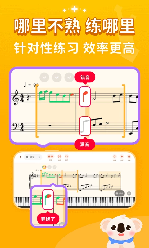 【智能精准纠错】 考拉智能陪练采用先进的AI技术,能够实时监测琴童的弹奏情况,在错误发生的瞬间立即进行纠正。这种即时反馈机制有效解决了传统练琴中"弹错不知道、越练越错"的困扰。系统不仅会指出错误音符,还会通过模拟钢琴键盘图示直观展示正确的琴键位置,帮助孩子一个音一个音地准确识别,逐步培养扎实的识谱能力。这种精准纠错方式大大提高了练习效率,避免了错误弹奏形成肌肉记忆。