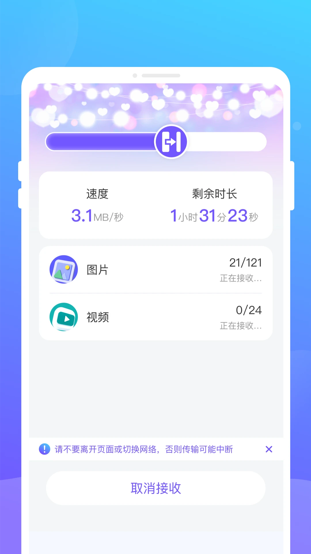 在操作体验方面,这款软件采用了极简设计理念。只需在新手机端点击接收,旧手机端点击发送,就能快速建立设备间的连接配对。整个传输过程无需复杂的设置步骤,即使是初次使用的用户也能轻松上手。相比传统的数据线备份方式,这种无线传输方案更加灵活方便,让您摆脱线材束缚,随时随地都能进行数据迁移。