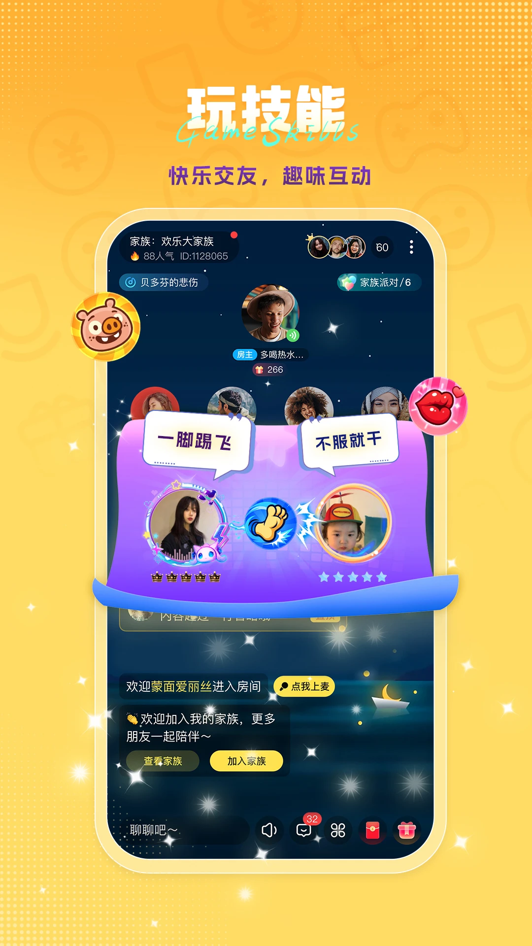 乐玩独创的互动技能系统,让你的社交表达不再单调。无论是抛送炫酷礼物的"送飞"技能,还是搞怪整蛊的"捣蛋"技能,都能为聊天增添无限乐趣。丰富的表情包和特效道具,让你的一举一动都充满个性。当麦上的小伙伴讲出精彩段子时,用"掌声雷动"技能表达赞赏;遇到心仪的对象时,用"爱心轰炸"传递心意。这些趣味互动不仅拉近了彼此距离,更创造了无数令人捧腹的欢乐瞬间。