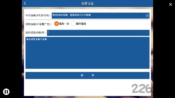 语音设置:自定义叫号语音和广告内容,可调节音量大小和播放间隔