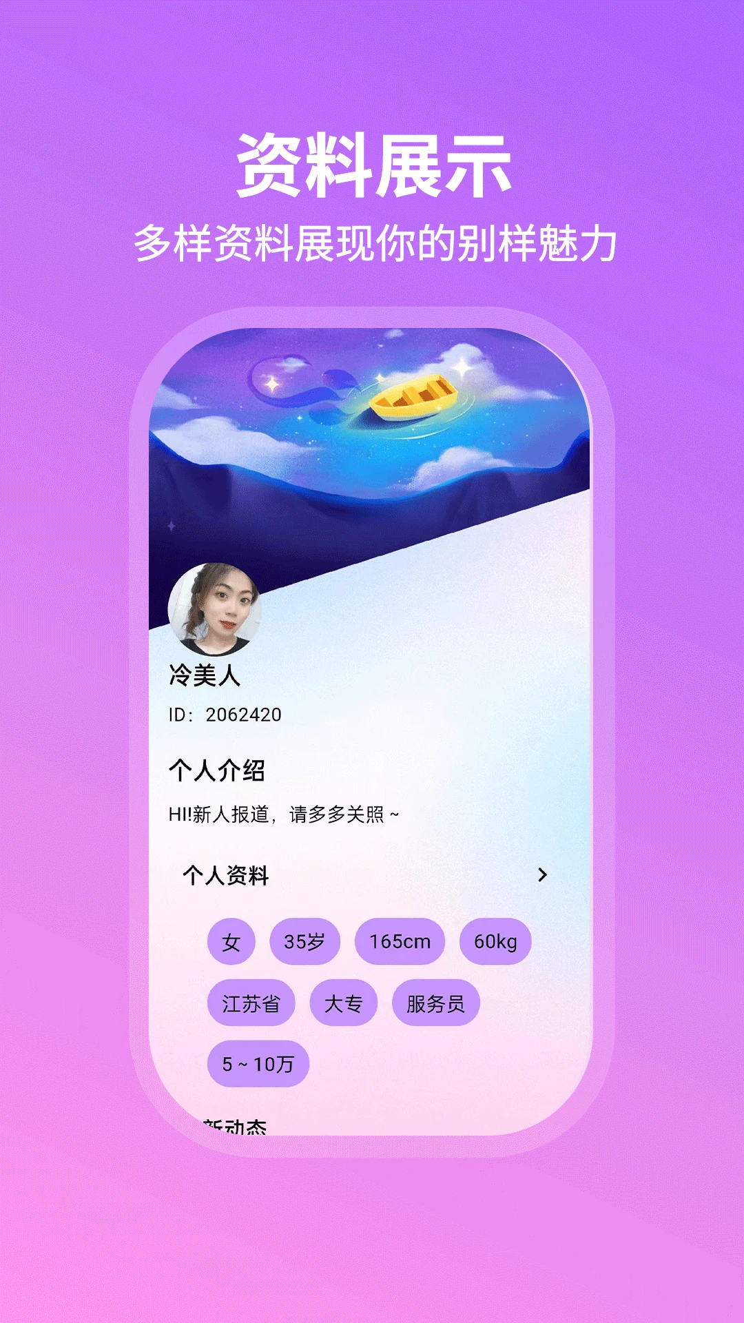 完善的"资料展示"系统让你可以全面了解潜在的聊天对象。每位用户的个人主页都经过精心设计,展示丰富的生活信息和兴趣爱好。只需轻轻滑动,就能获取你想了解的所有内容,帮助你更快找到志趣相投的朋友。同时,严格的实名认证机制确保了用户资料的真实性。