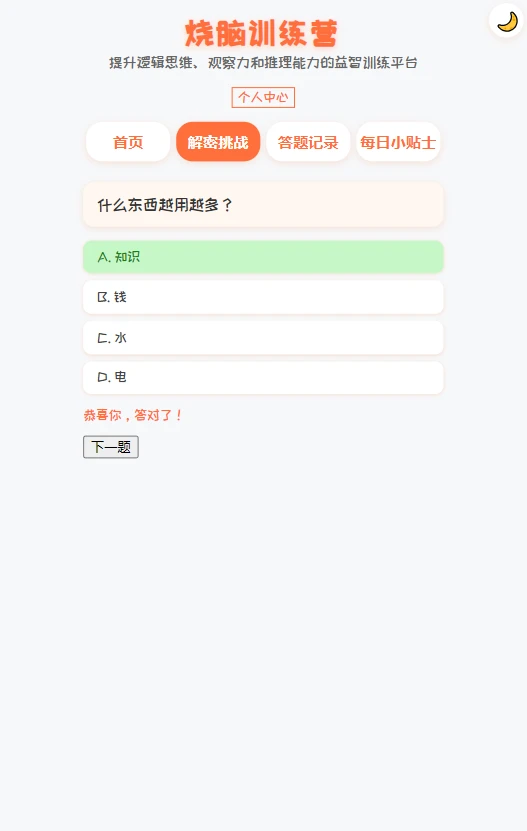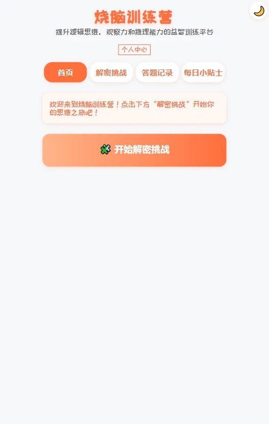 烧脑训练营是一款专为提升逻辑思维、观察力与推理能力打造的沉浸式益智平台。平台汇聚了数百种精心设计的解密挑战题,涵盖图形推理、数字谜题、空间想象等多元题型,结合认知心理学原理,通过每日科学训练帮助用户突破思维定式。独特的答题记录系统可实时追踪能力变化曲线,让每一分进步都清晰可见。无论是想锻炼大脑的上班族,还是备战竞赛的学生,都能在这里找到适合自己的成长路径。