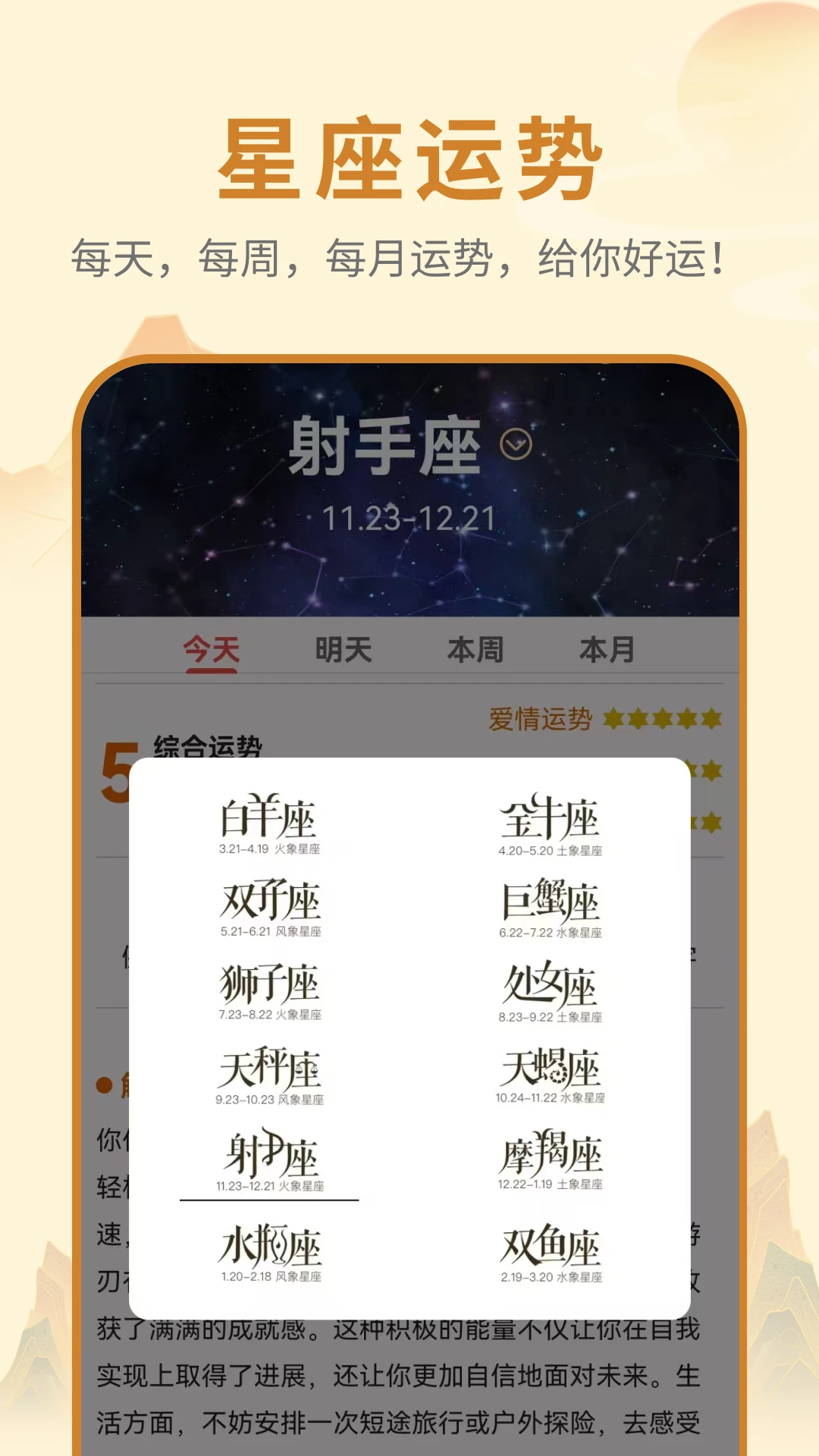 探索星座的奥秘,了解每日、每周、每月的星座运势。我们的星座功能,让您的星座之旅更加精彩。提供十二星座的详细解析,包括爱情、事业、财运等各方面运势预测。新增的星座配对功能,帮助您更好地了解人际关系。精美的星座插图和专业的运势分析,让您在娱乐之余获得有价值的参考信息。