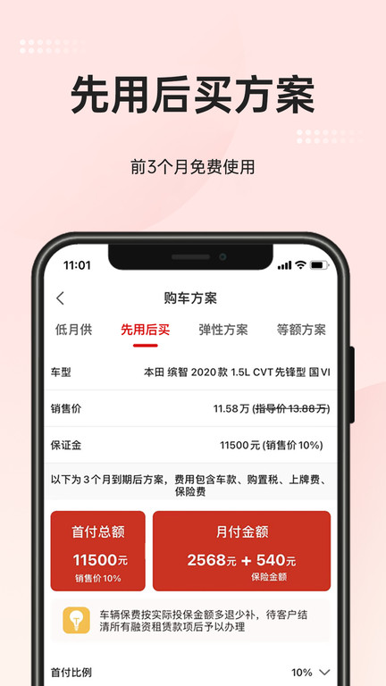 【超低首付】首付比例最低仅需5%,提供最长5年分期方案,支持"1+3"或"等额"多种还款模式自由选择;
