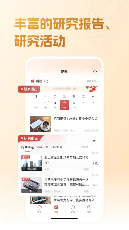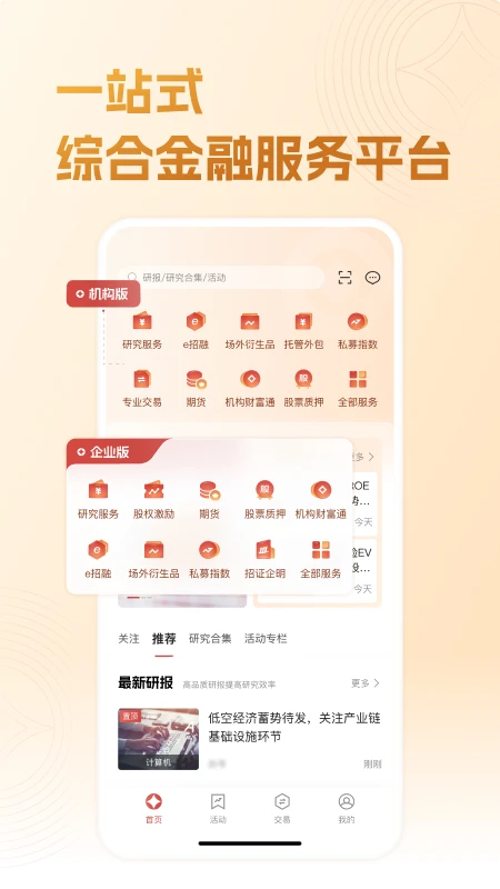 招商证券机智APP的核心服务涵盖多个业务领域:在投研服务方面,平台提供权威的研究报告和丰富的研究活动,帮助客户把握市场动态;在资产托管领域,提供高效便捷的托管外包服务;在场外衍生品市场,为客户量身定制风险管理方案;在融资融券业务中,通过转融通服务满足客户多样化需求。此外,平台还提供专业交易服务、股票质押融资、股权激励设计、机构理财产品配置、期货交易支持等多元化服务。