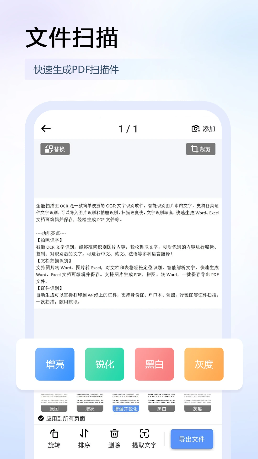 软件支持多种便捷的识别方式,用户既可以选择导入本地图片进行识别,也可以直接使用拍照功能实时捕捉画面中的文字内容。其扫描速度极快,能在瞬间完成文字提取工作,同时保持极高的识别准确率,大大提升了工作效率。识别结果可直接导出为可编辑的Word或Excel文档,方便用户进行后续的编辑和整理工作,还能一键生成PDF文件,满足不同场景下的文档分享需求。