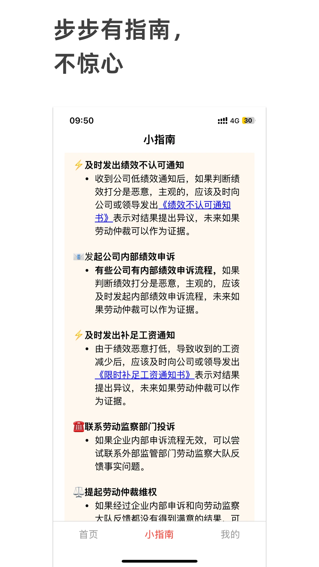 第三,APP提供丰富的实用指南,针对职场中常见的法律问题给出具体解决方案。比如:试用期突然被辞退该如何维权?加班费的计算标准是什么?请病假是否需要公司批准?孕期女职工的特殊保护有哪些?绩效评分不公导致降薪该如何应对?工伤认定流程是怎样的?待岗期间的权益保障?离职当天的注意事项等等。