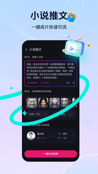 -一键成片:将推文等文字内容一键转化为视频,快速引流变现。智能算法自动匹配最佳转场和特效,让每个视频都充满专业感。