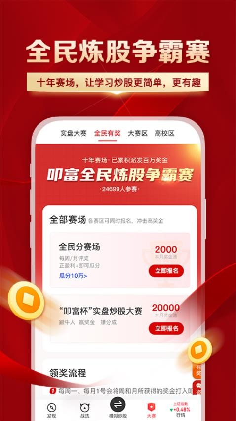 定期举办各类主题炒股赛事,包含短线挑战、价值投资等多元化赛制,参赛者可通过排行榜实时查看排名变化,在竞技中检验投资水平,优胜者将获得丰厚奖励。