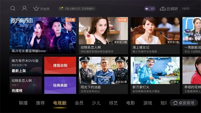 搜狐视频TV版(又名云视听悦厅TV)是搜狐专为智能电视打造的影视点播平台,集海量资源与沉浸式体验于一体。它不仅延续了手机/电脑端的丰富内容库,更针对大屏场景优化了交互设计,涵盖电影、电视剧、综艺、体育、亲子等全品类内容,尤其以独家美剧和自制剧为特色亮点。平台提供从高清到蓝光的多级画质选择,适配各类Android电视及机顶盒设备,通过智能推荐算法和情感化界面设计,让用户享受影院级视听盛宴。其创新的"人格化标签"系统和用户共建机制,重新定义了家庭场景下的视频服务体验。