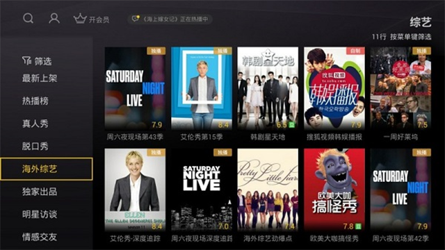 搜狐视频定制版电视台,包含24小时轮播的美剧频道、经典港剧频道等8个特色主题频道