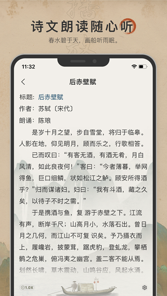 分段译注功能让学习更轻松,点击诗文相关按钮即可查看分段译文和详细注释,逐句理解诗文含义。背诵模式支持多种难度选择,从单句到整篇循序渐进,帮助用户高效记忆。朗诵功能提供专业配音,用户可以边看边听,感受古诗文的韵律之美。