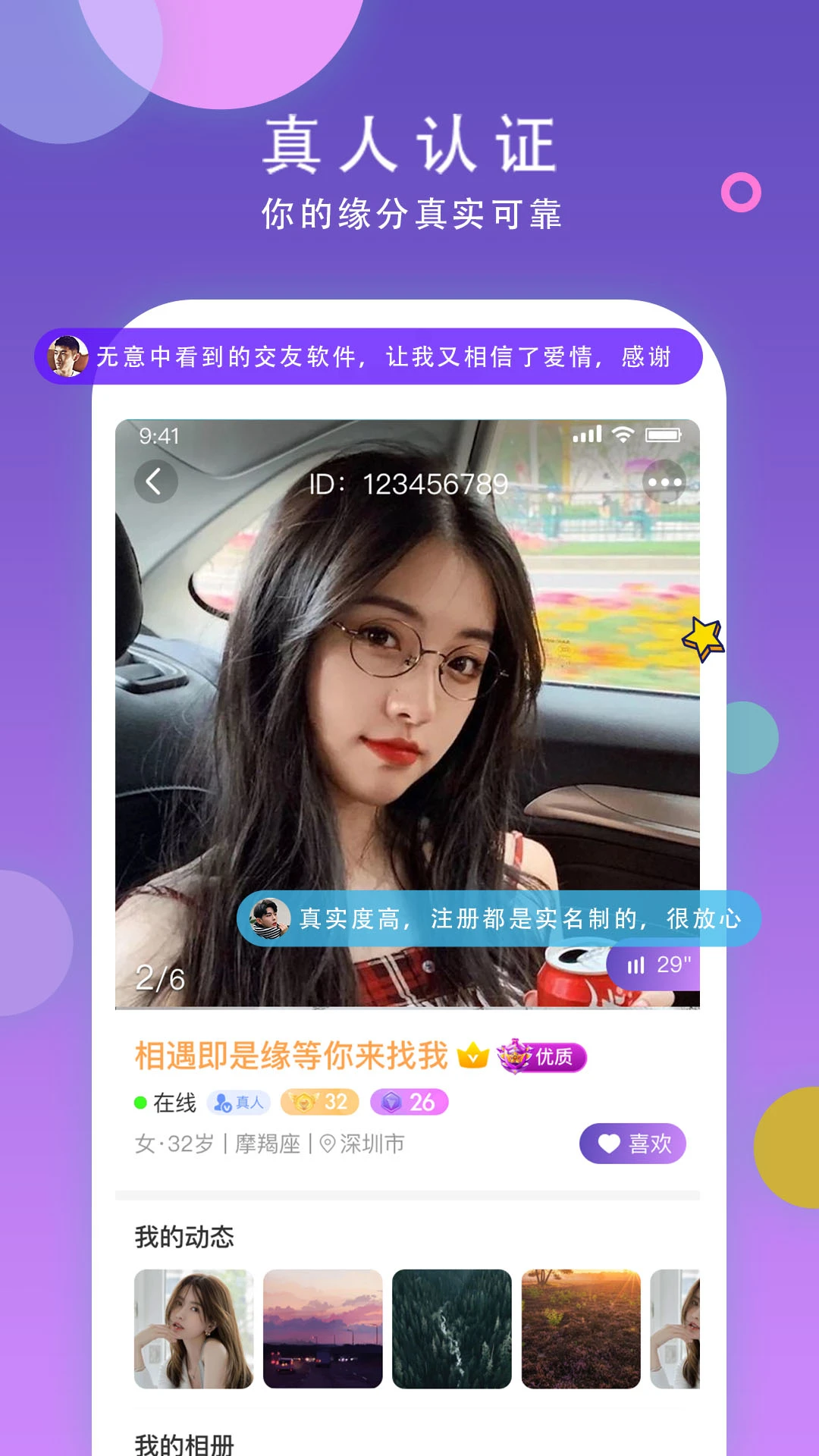 平台采用严格的实名认证机制,所有用户都经过官方真人验证,确保交友环境的真实性。我们坚决抵制机器人回复和虚假信息,配备专业审核团队24小时监控平台内容。通过多重安全机制为用户打造纯净的交友空间,让每一次互动都充满诚意。