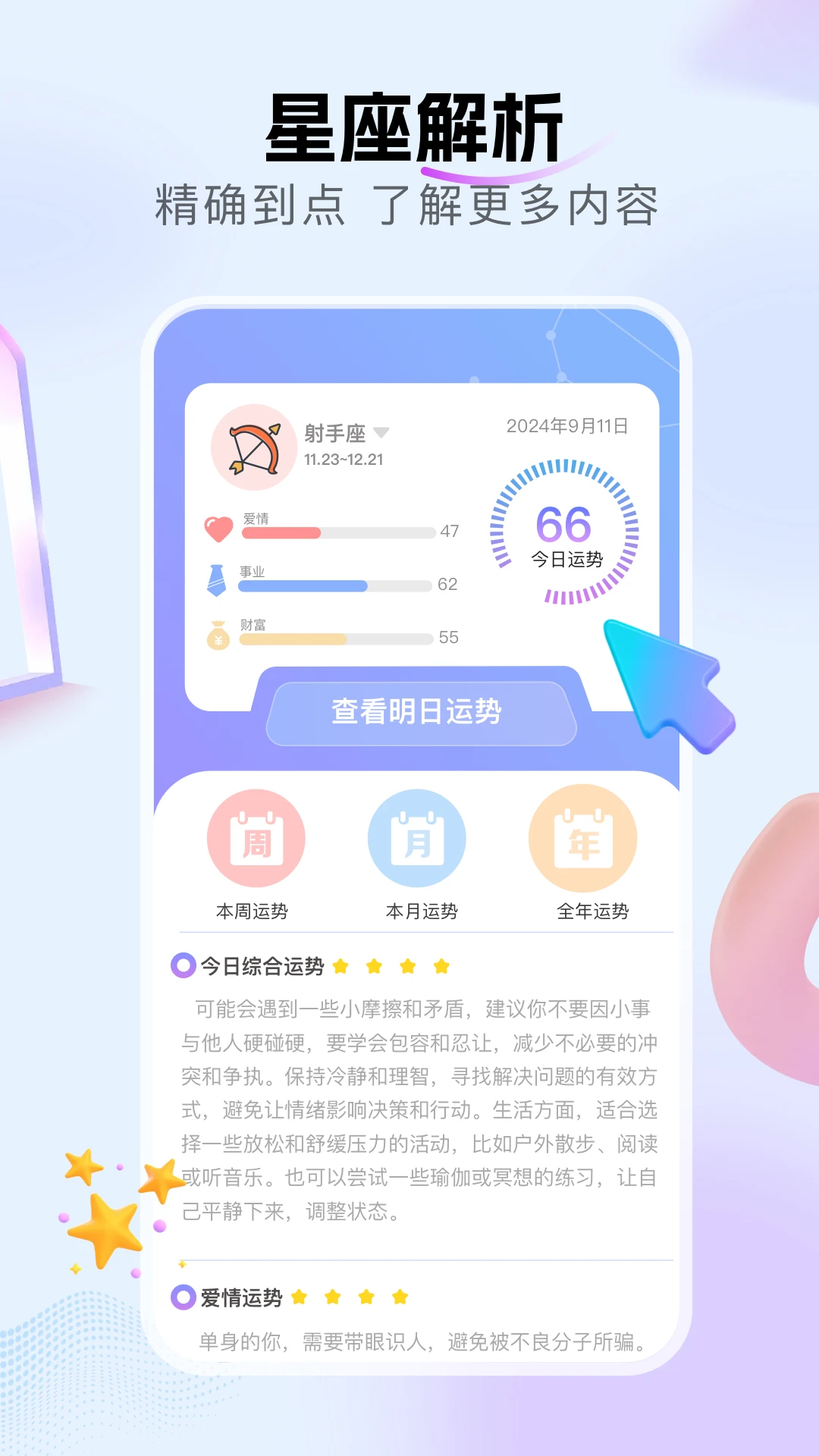 这款星座运势软件是您日常生活的好帮手,不仅能满足您对星座运势的好奇心,更能为您的重要决策提供参考。无论您是想了解感情发展、事业走向还是财富运势,都能在这里找到专业的分析和建议。现在就下载体验,开启您的星座运势探索之旅吧!