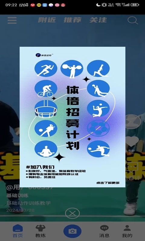 教练:体倍App拥有庞大的专业教练资源库,涵盖各类体育项目的认证教练。每位教练都经过严格审核,具备丰富的教学经验和专业资质。用户可以根据自己的运动目标、技能水平和时间安排,筛选合适的教练。平台提供详细的教练档案,包括教学视频、学员评价、资格证书和训练成果展示,帮助用户做出明智选择。部分教练还提供线上1对1指导服务,让用户足不出户就能获得专业训练。